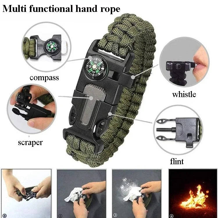 Multifunction survival bracelet with compass, scraper, flint & whistle.